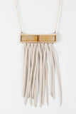 This double layer necklace features two bars, one small simple bar on a shorter chain, and a larger bar with stone detailing and vegan leather fringe.