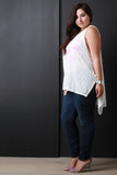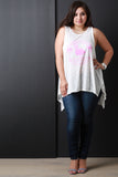 This plus size top features a thin sweater knit fabrication, rounded neckline, sleeveless design, "Flamingo Beach" graphic print, and a wide square cut high low hem with side slits. Accessories sold separately. Made in U.S.A. 62% Rayon, 38% Polyester.