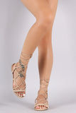 This lace up design across the vamp. Open toe silhouette with a sling back strap.