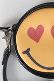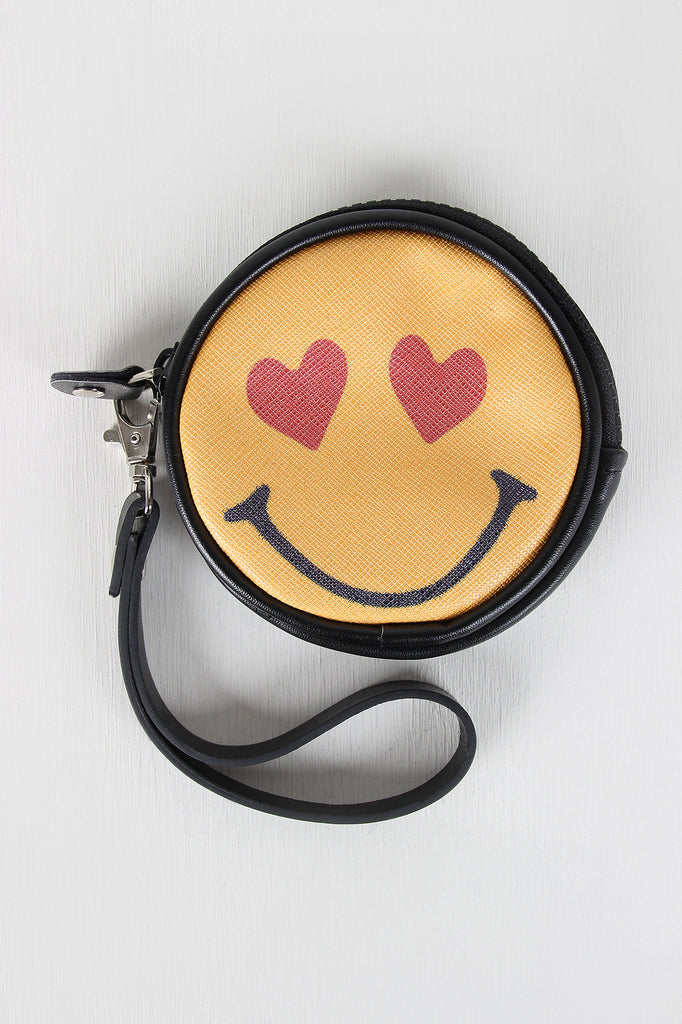This cute coin purse features a circle design, vegan leather fabrication, heart eye emoji face printed on it with a removable wrist strap.