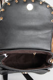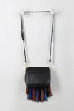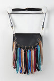 This bag features half circle silhouette, vegan leather fabrication, multi color suede fringe detail, fully lined with a zipper pocket, and a outre pocked under the flap. with a magnetic closure and an adjustable buckle strap.