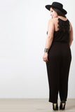 This chic plus size jumpsuit features a sleeveless design,spaghetti straps, elastic waist, faux drawstring, eyelash lace back, soft knit fabrication, button closure, and straight leg pants. Accessories sold separately. 97% Rayon 3% Spandex.