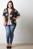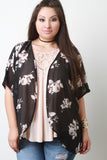 This plus size kimono features an open front, chiffon fabrication, floral print, gather detail at shoulder, dolman sleeve and a high low hem. Accessories sold separately. 100% Polyester